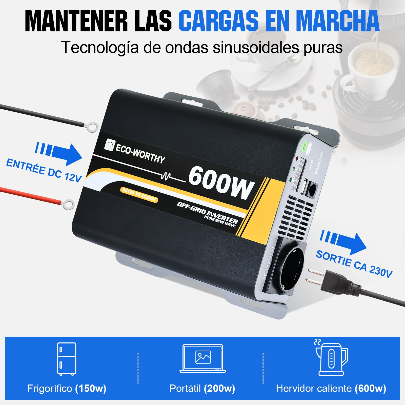 -70%Inversor de Onda Sinusoidal Pura de 600W de 12V a 230V para Kits Solares Aislada—